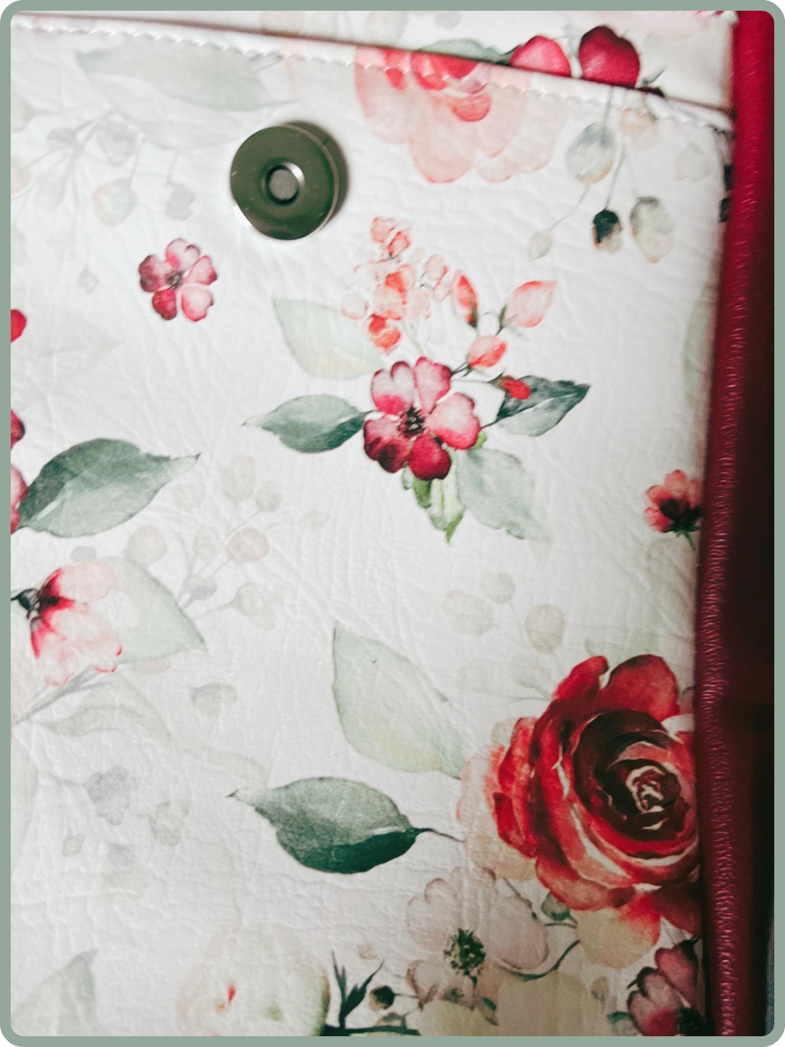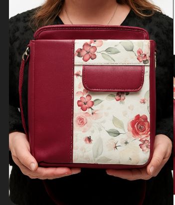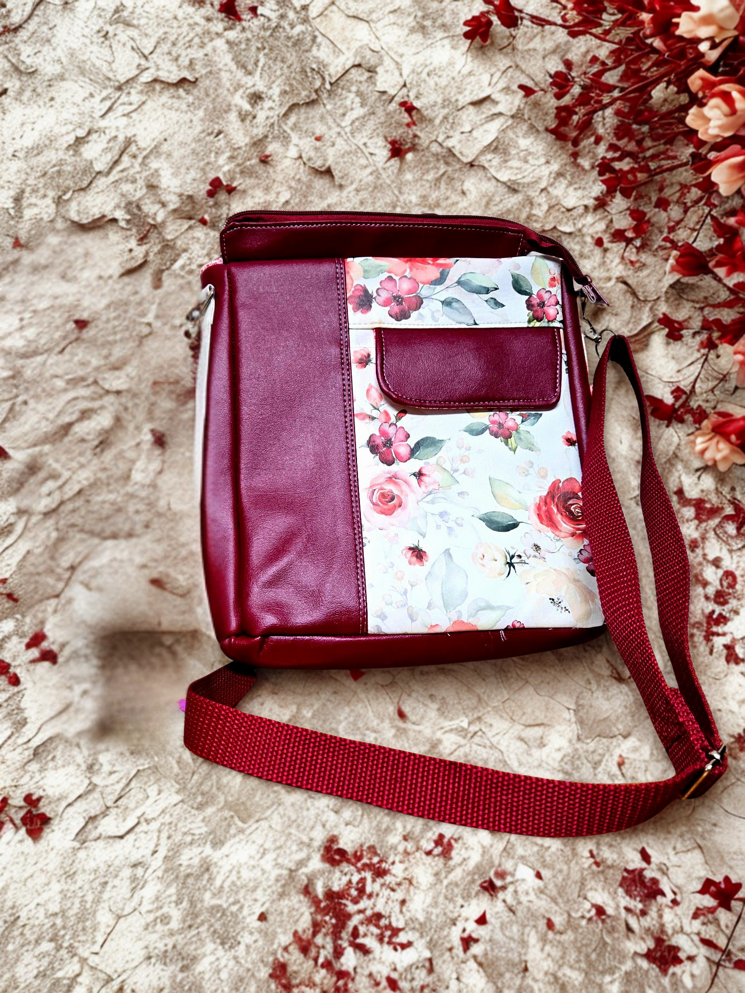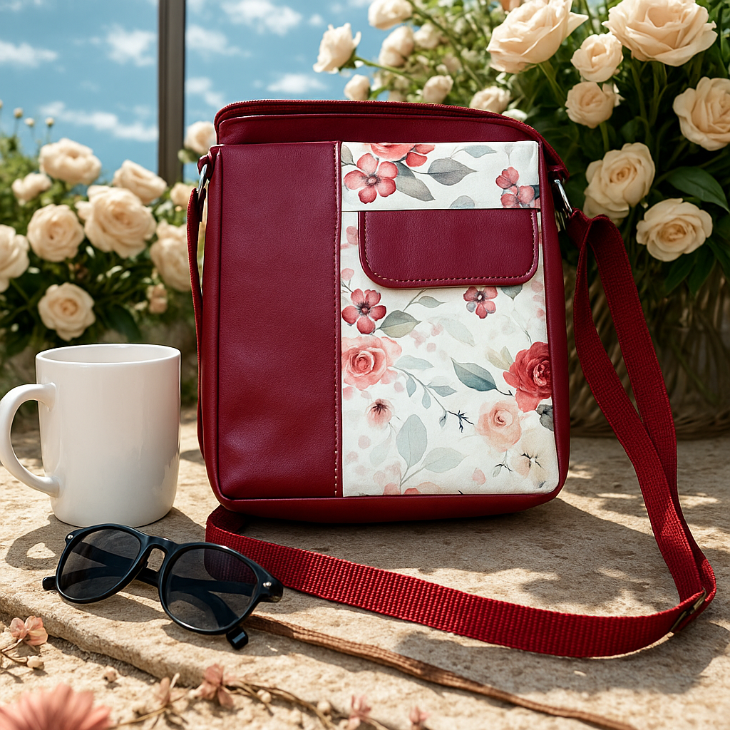 Red Floral Crossbody Bag – 11"x13" Faux Leather, Handmade, Adjustable Strap