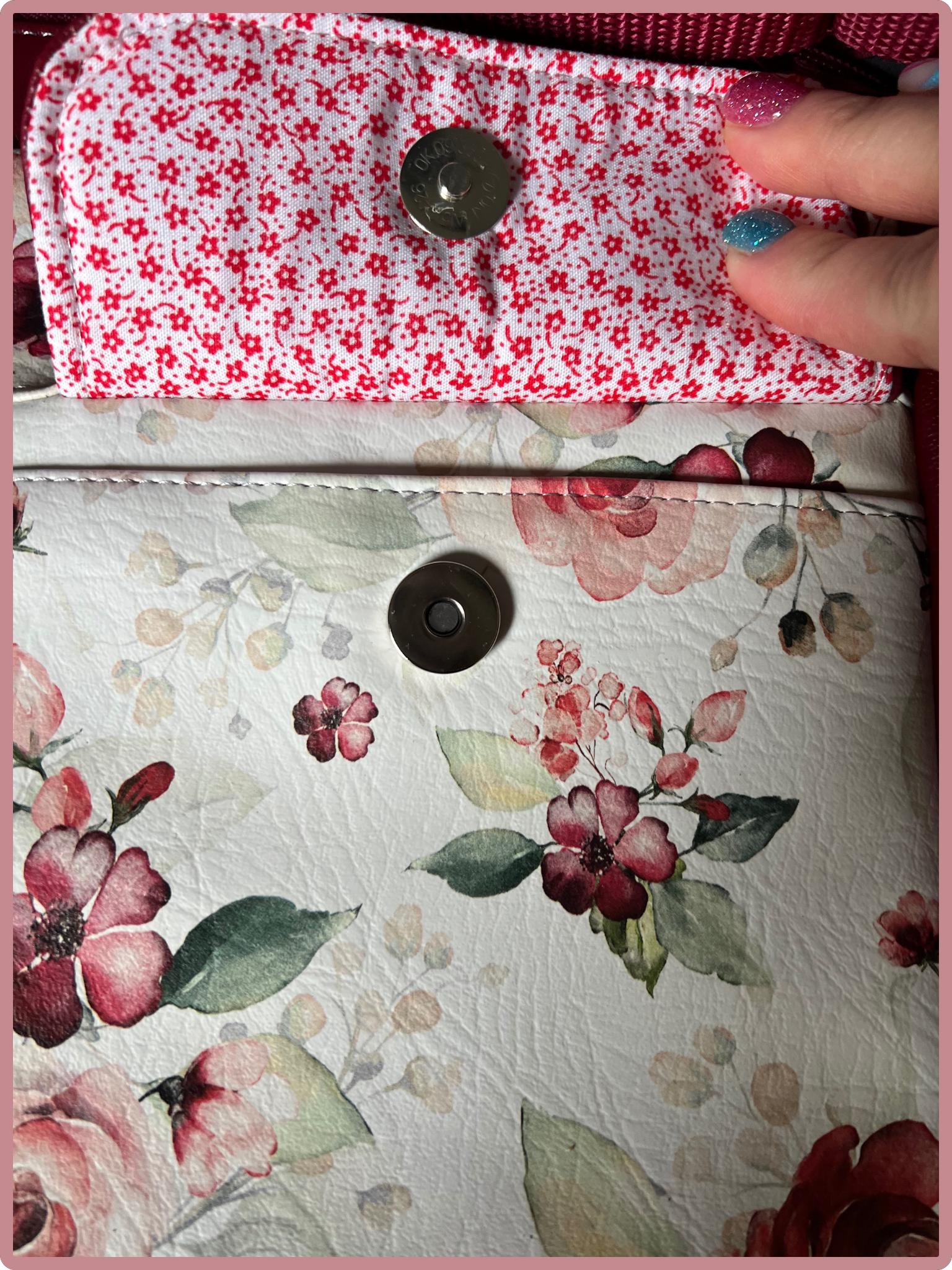 Fully lined floral interior with divided slip pockets and zipper pocket