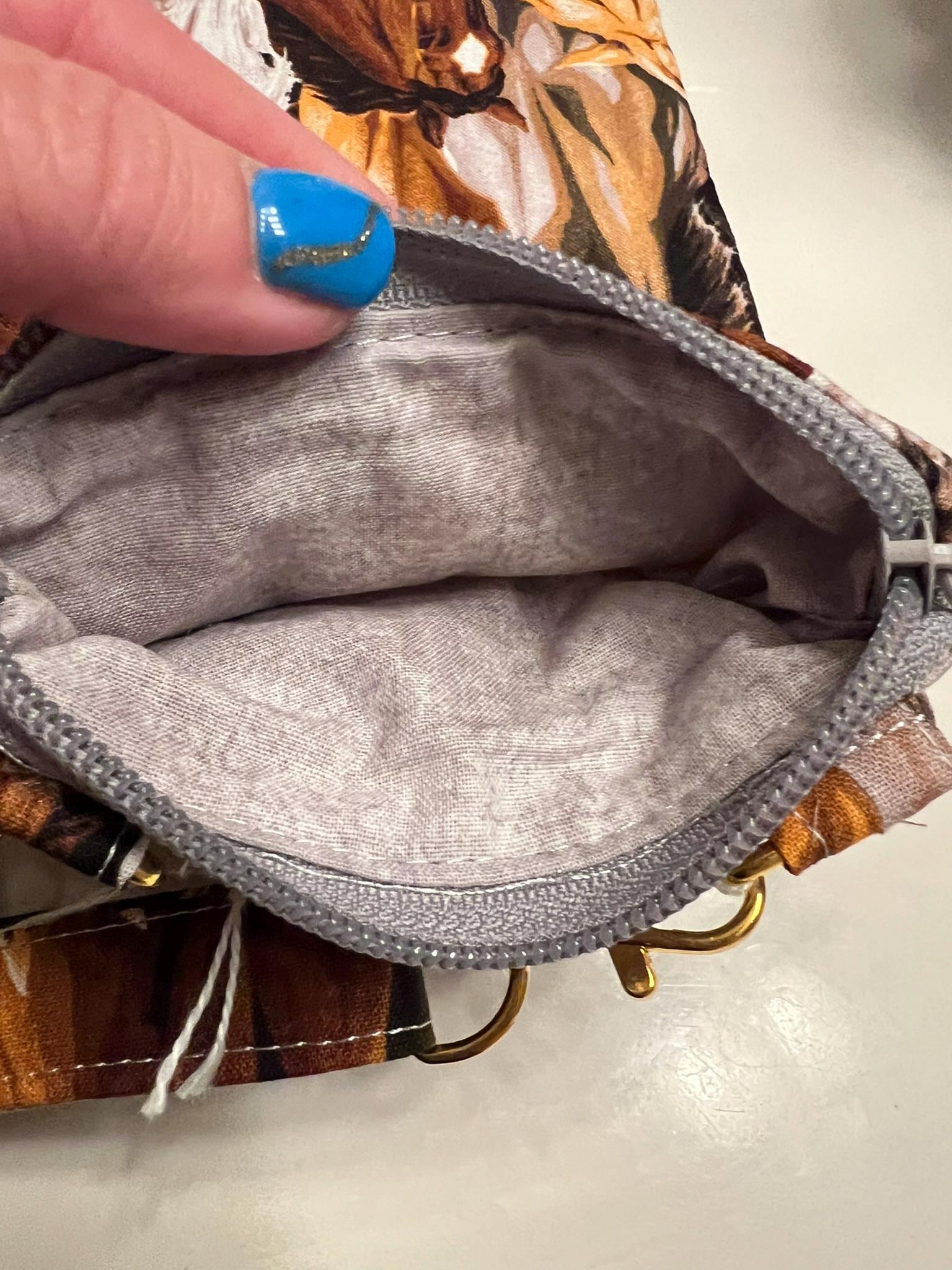 This 7 × 5-inch mini crossbody features Granny’s best-selling galloping-horse cotton print, gold swivel-hook hardware, and a secure top zipper. A front snap pocket stashes cards or earbuds, while the slender detachable strap lets you clip the pouch to a belt loop or wear it as a lightweight crossbody for festivals, rodeos, or a quick feed-store run.
