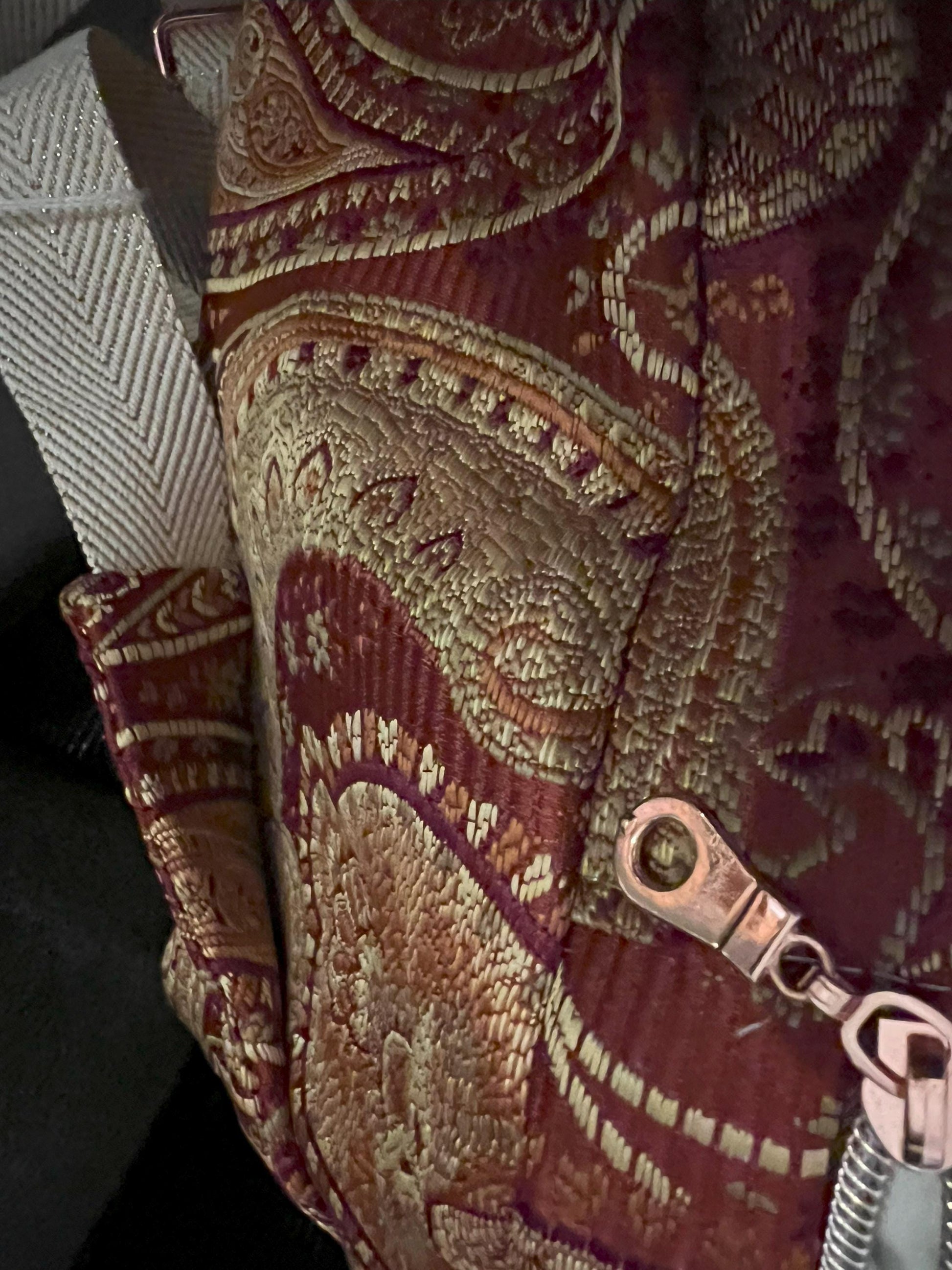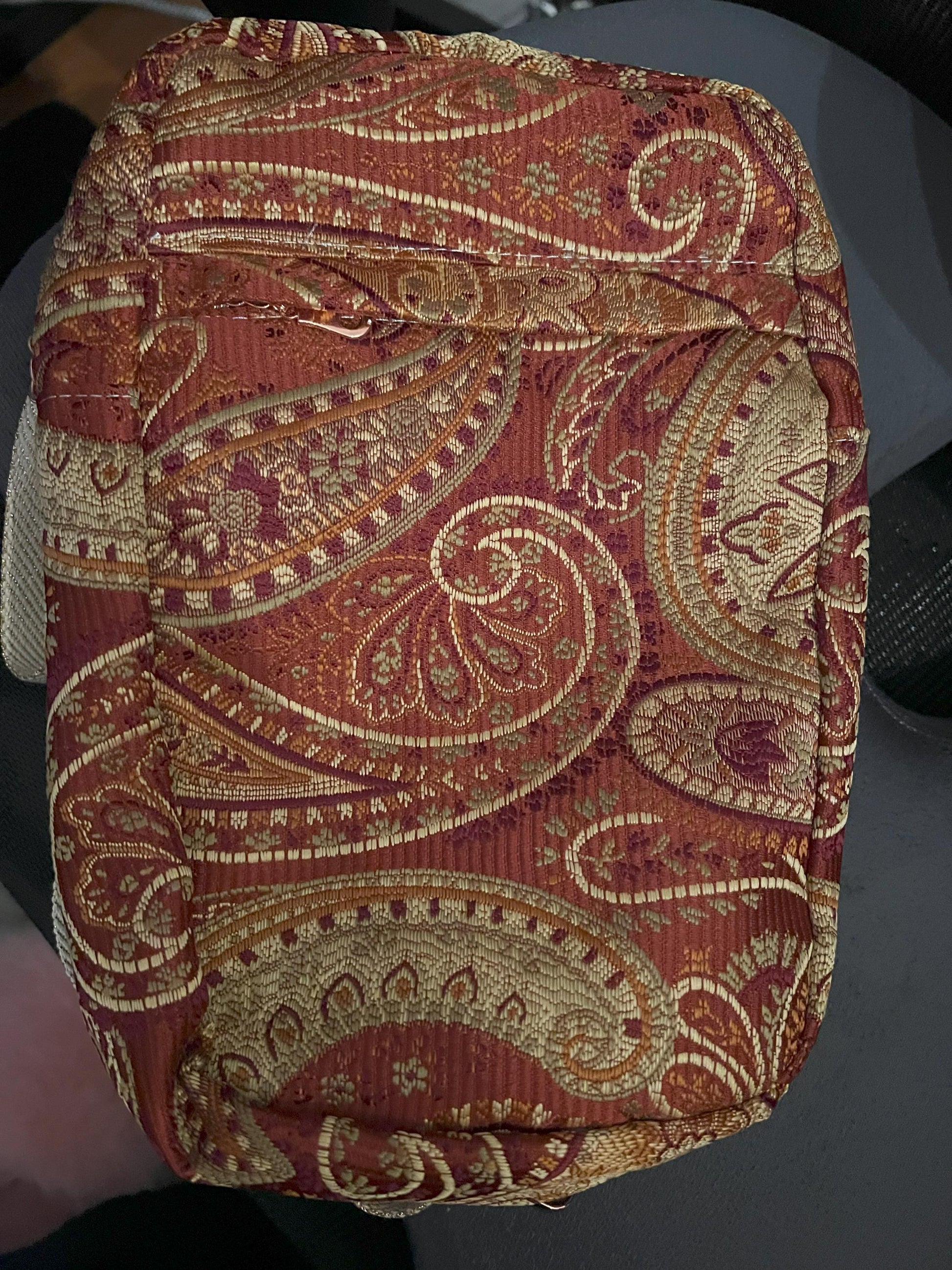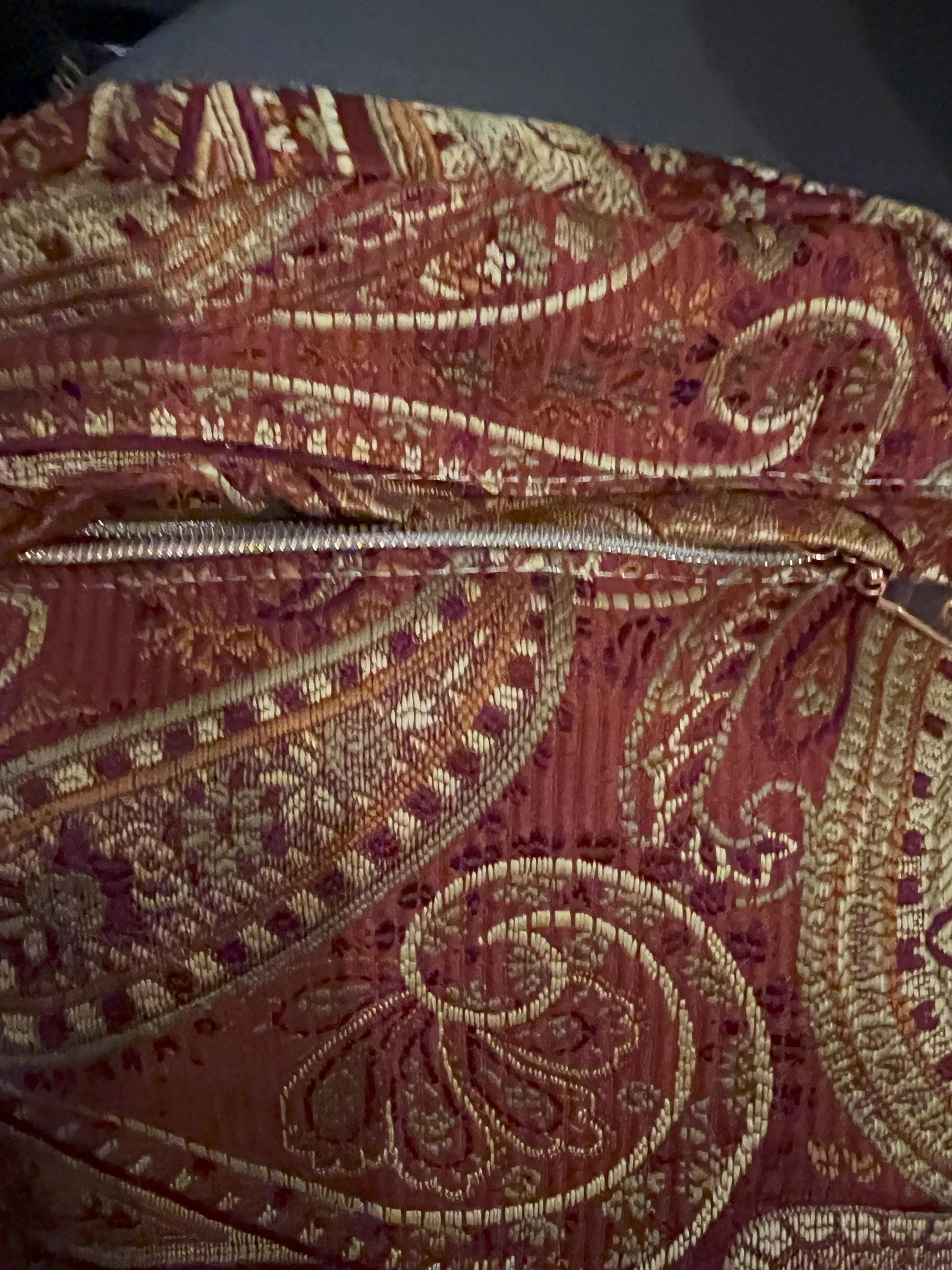 Handmade red paisley crossbody bag with a sparkle-glitter adjustable strap and secure zipper pocket—an eye-catching gift for her that keeps hands free at festivals, errands, or everyday outings.