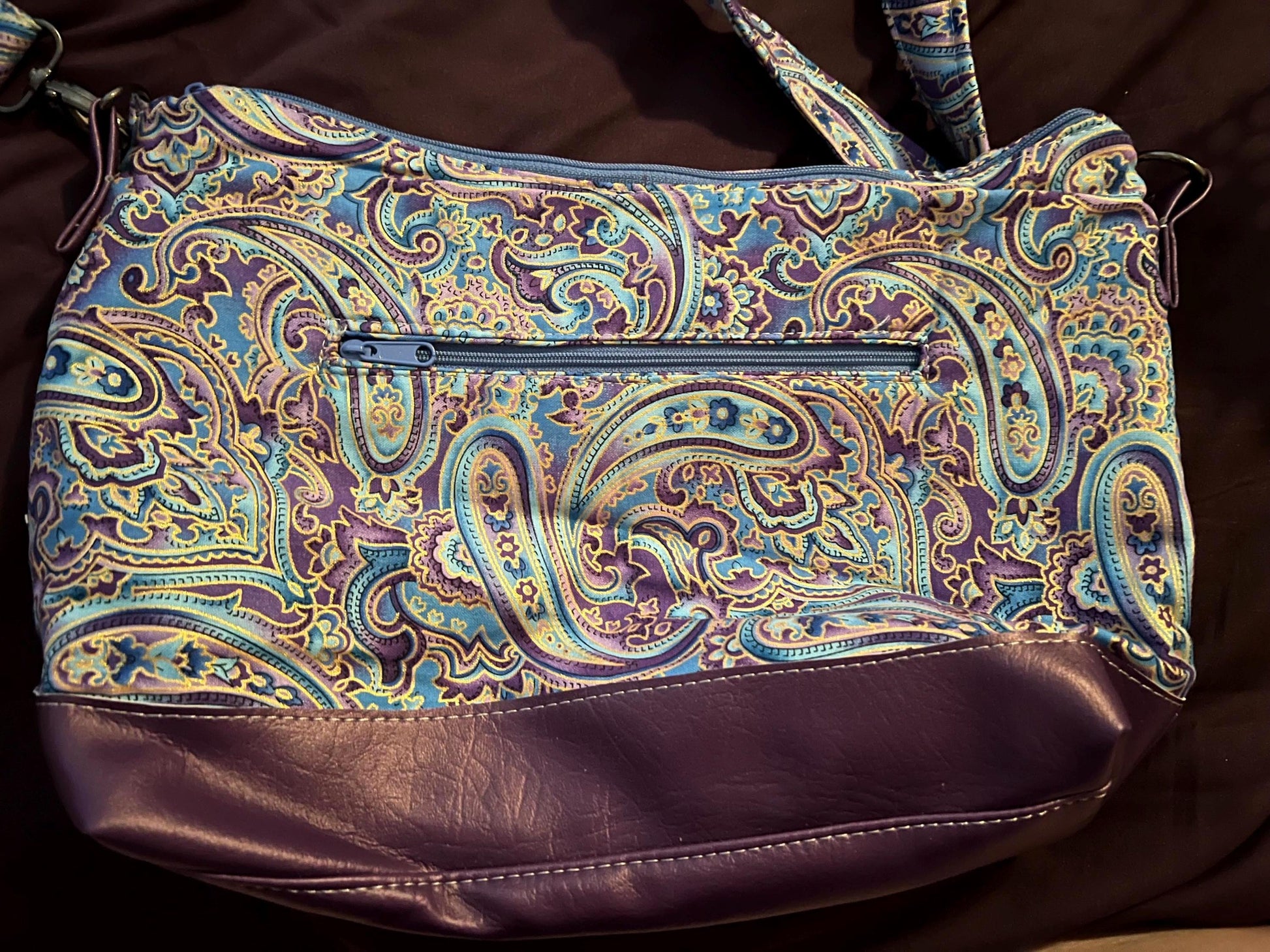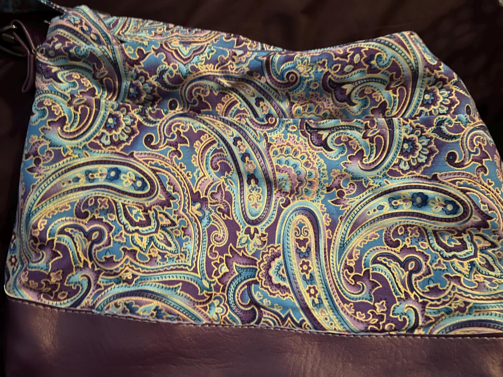 This 8.5 × 12-inch crossbody blends rich eggplant-purple faux leather with a vibrant teal-and-gold paisley cotton print. A front zip pocket keeps your phone handy, while the fully adjustable (and removable) fabric strap lets you switch from shoulder to true crossbody carry in seconds. Soft lilac lining, an inner zip pocket, and a two-section slip pocket keep essentials organized—whether you’re strolling farmers’ markets, heading to class, or grabbing coffee with friends. Handmade one-of-a-kind in South Carolina.