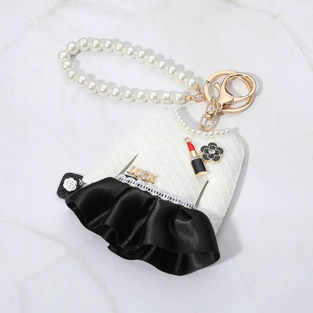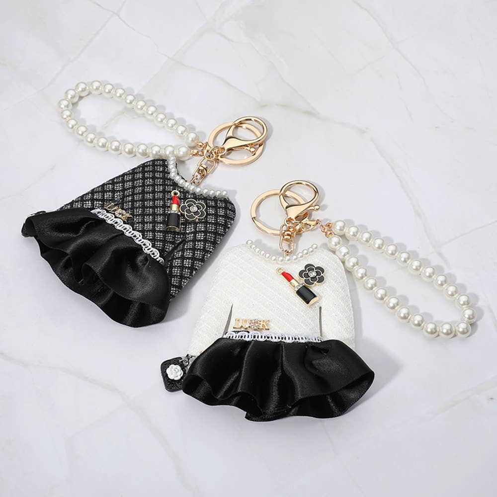 Pearl Luck Tweed Jacket Keychain – Black Mini Purse Bag Charm with Gold Chain | Sensibling Corp.