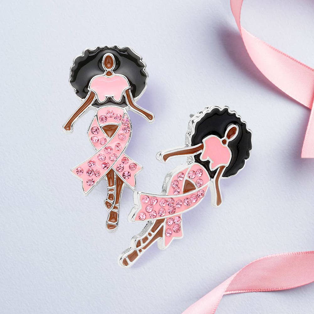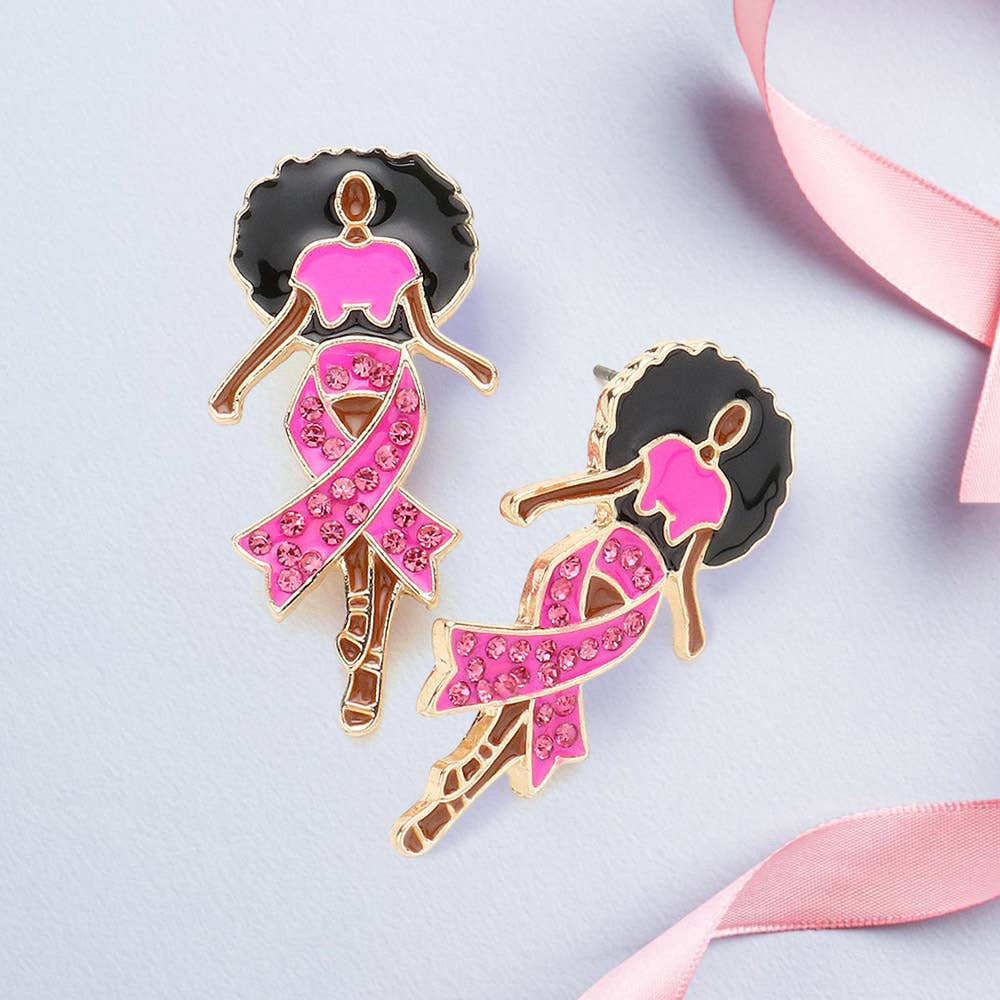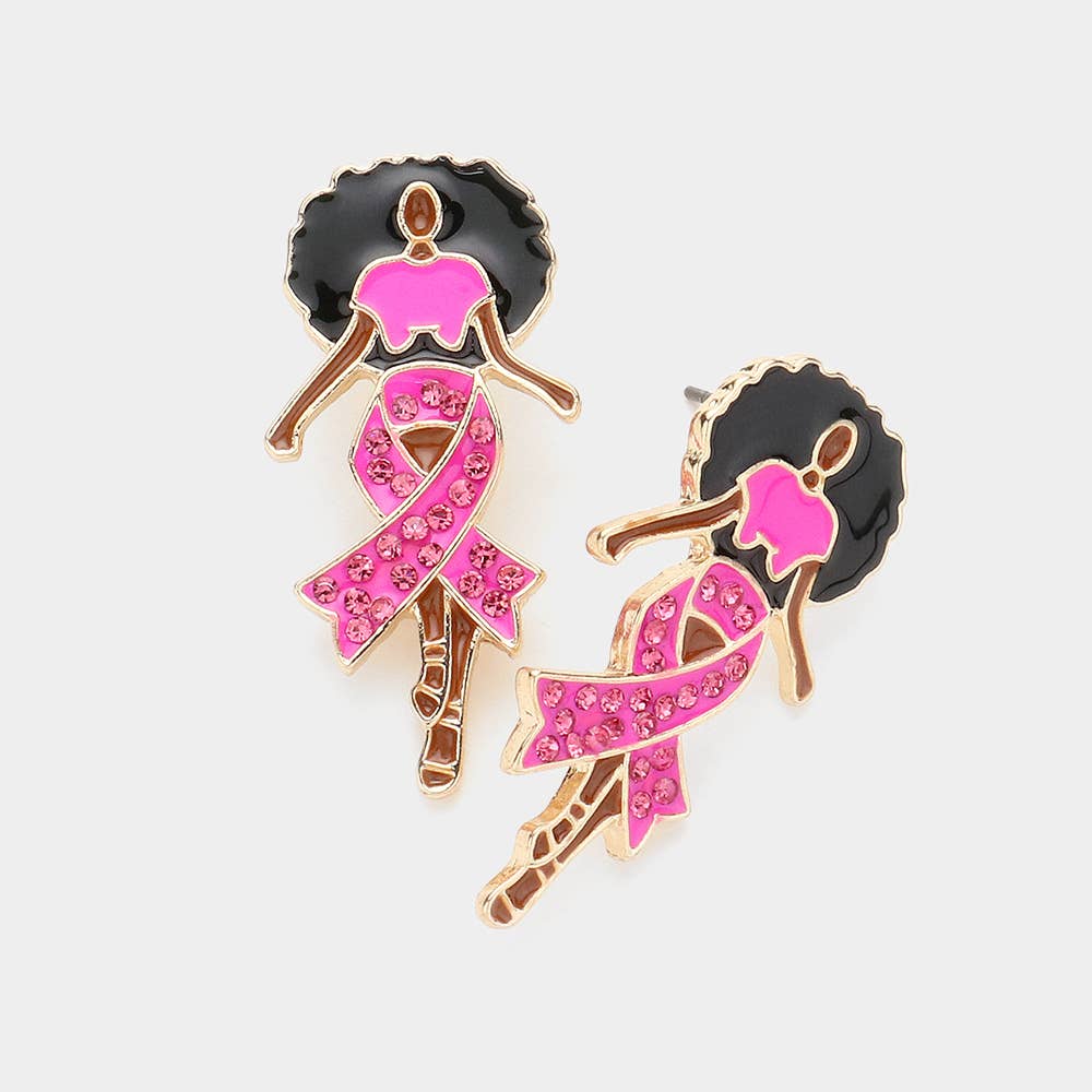 Add strength and sparkle to your accessory game with these powerful statement earrings. Featuring a confident Afro woman silhouette adorned with an enamel pink ribbon and shimmering rhinestones, these earrings symbolize courage, hope, and unity.