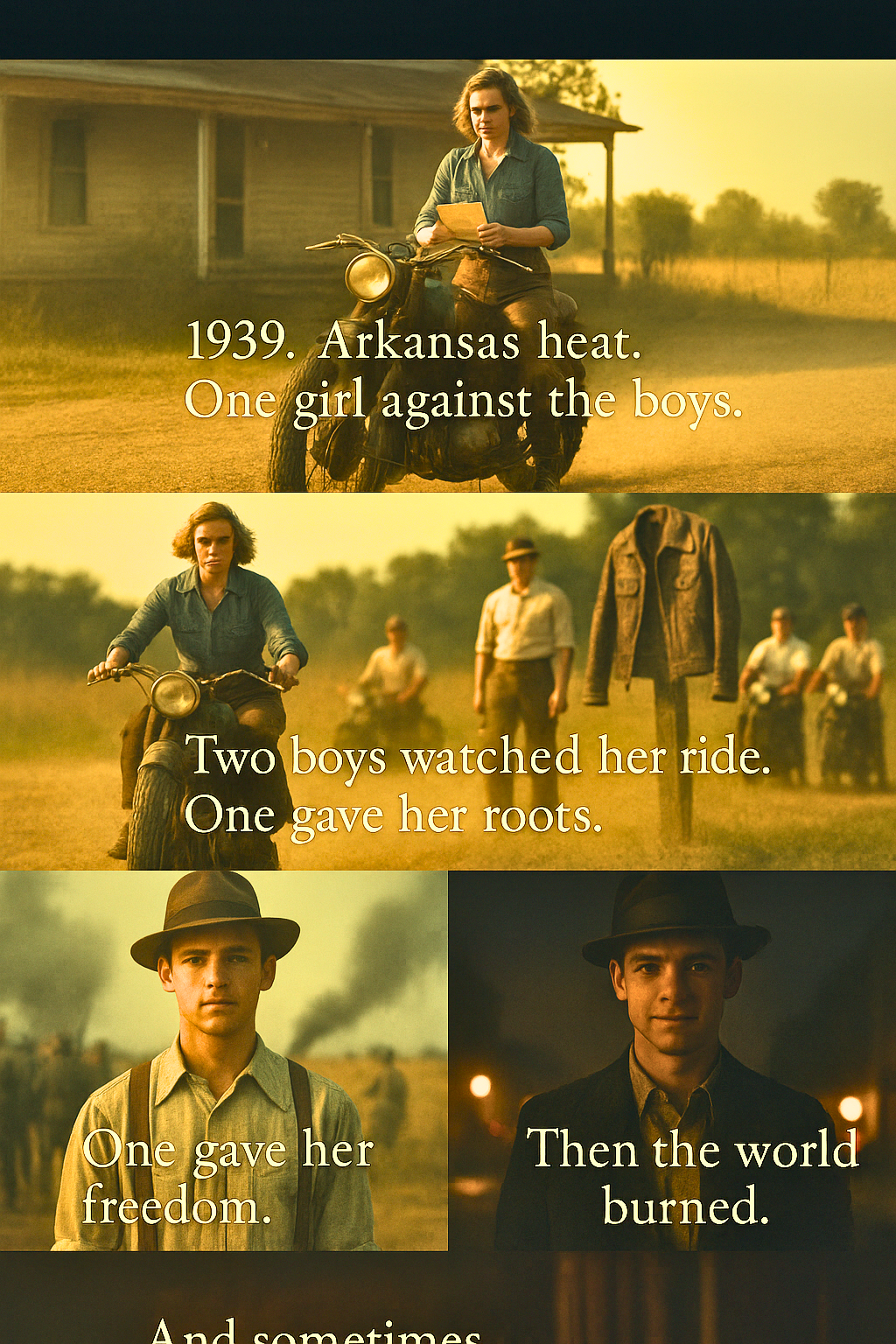 In the heart of 1940s Arkansas, Reba Jean races motorcycles dodges expectations and dares to love two men on opposite sides of war and loyalty. One gives her passion. The other shows her forever.