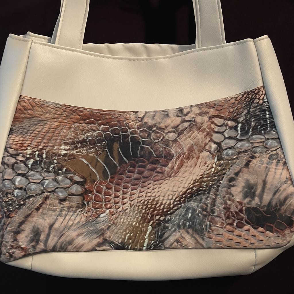 Chic, sleek, and ready to carry it all — this handmade faux leather tote pairs a bold snake-print panel with a smooth off-white body and matching handles. Spacious yet structured, it's the perfect everyday accessory for errands, work, or a night out. Details: