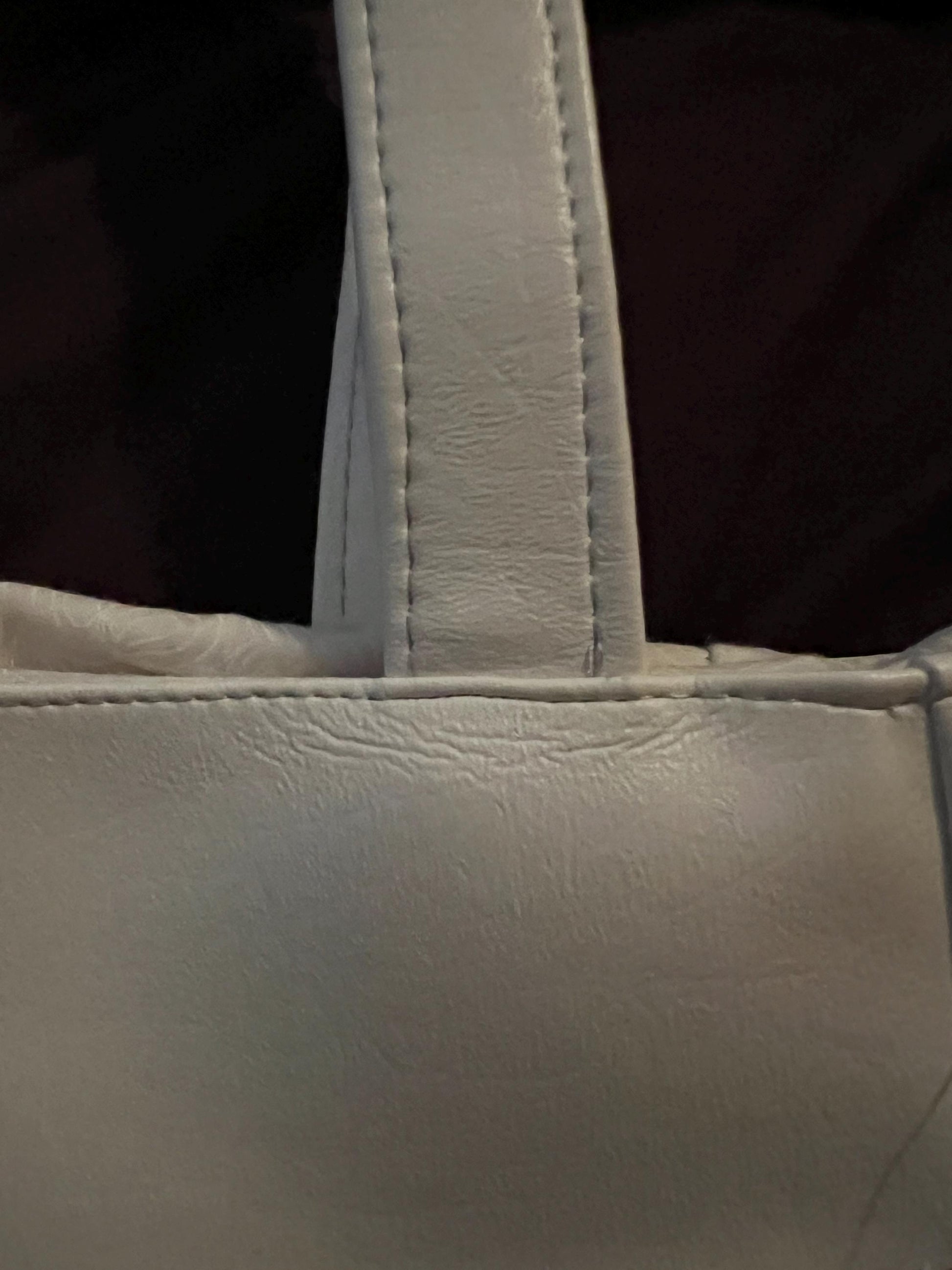 • Off-white faux leather body and straps